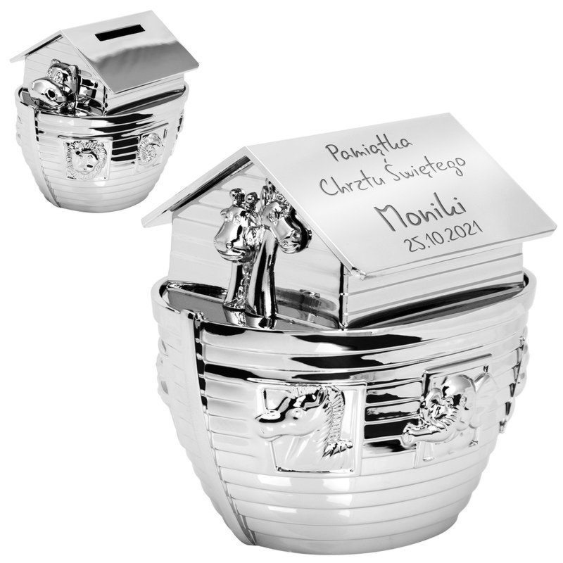 Posrebrzana skarbonka Arka Noego z grawerem laserowym na dachu (max. 5 linii po 25 znaków) na chrzest, roczek i urodziny
