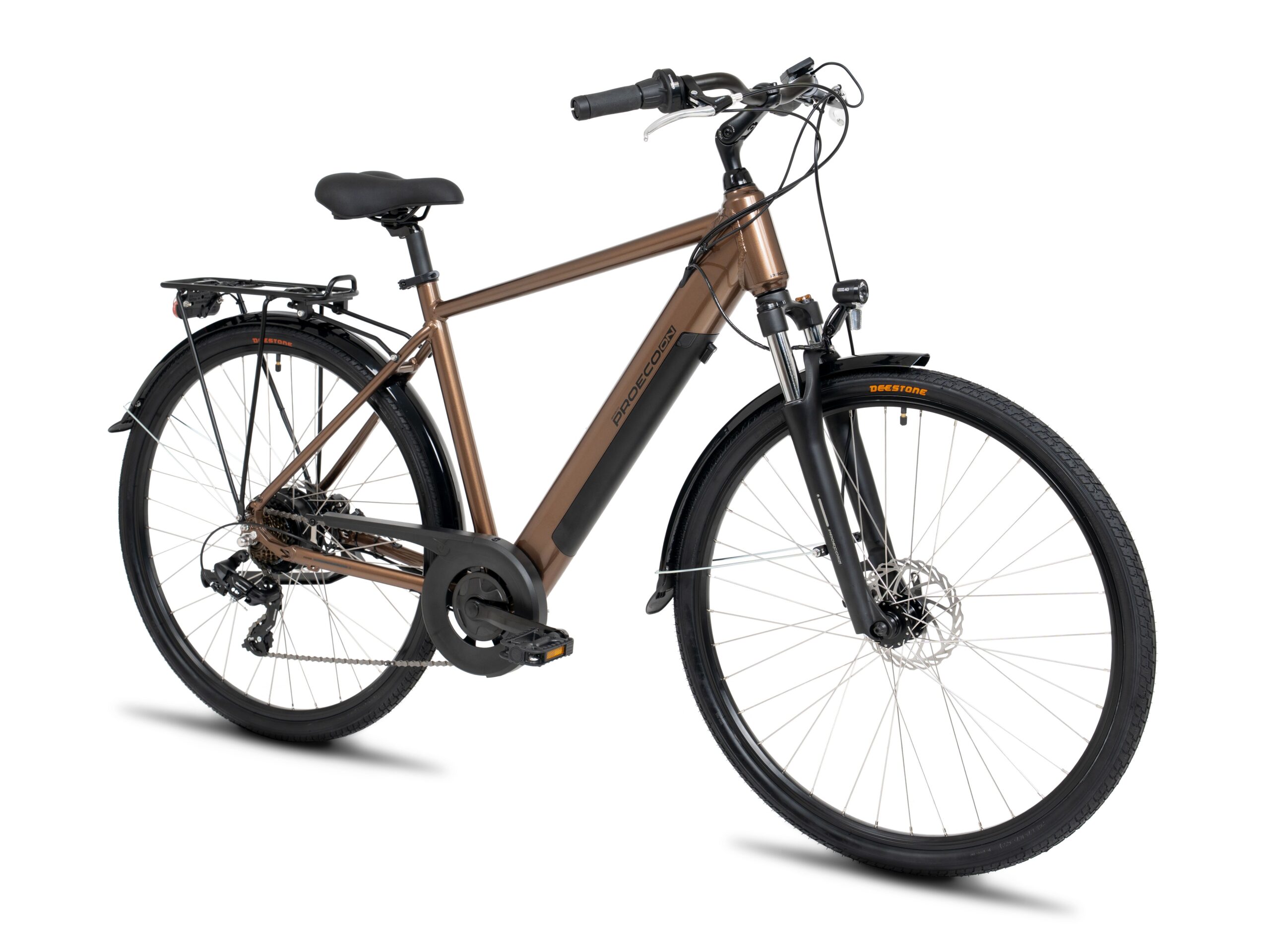 <h3>Proeco TRK High Frame 2.0 – niezawodny rower elektryczny dla aktywnych mężczyzn</h3><p>Proeco TRK High Frame 2.0 to solidny i wszechstronny rower elektryczny trekkingowy zaprojektowany dla mężczyzn, którzy cenią wydajność, komfort i nowoczesne rozwiązania technologiczne. Wysoka, mocna aluminiowa rama typu High Frame zapewnia doskonałą sztywność i stabilność prowadzenia, idealną zarówno do jazdy po mieście, jak i na dłuższych trasach turystycznych.</p><p>Napędzany przez mocny silnik Ananda w tylnym kole, rower gwarantuje płynne i dynamiczne wspomaganie, które ułatwia pokonywanie wzniesień i długich dystansów. Zintegrowany w ramie akumulator o pojemności 504 Wh zapewnia duży zasięg i estetyczny wygląd całej konstrukcji.</p><p>Za płynną zmianę przełożeń odpowiada przerzutka Shimano Tourney, a amortyzator przedni skutecznie tłumi nierówności, zwiększając komfort jazdy. Ergonomiczna kierownica i wygodne siodełko pozwalają na przyjemną, naturalną pozycję nawet podczas wielogodzinnych wypraw.</p><p>Bezpieczeństwo w każdych warunkach zapewniają mocne hamulce tarczowe, gwarantujące skuteczne zatrzymanie niezależnie od pogody. Całość uzupełniają pełne błotniki, stabilna podpórka i zintegrowane oświetlenie, dzięki czemu rower jest gotowy do jazdy zaraz po wyjęciu z pudełka.</p><h3>Najważniejsze cechy:</h3><ul><li>Mocna i lekka aluminiowa rama typu High Frame – męska geometria</li><li>Silnik Ananda w tylnym kole – płynne wspomaganie i dynamiczna jazda</li><li>Akumulator 504 Wh wbudowany w ramę – duży zasięg i elegancki wygląd</li><li>Przerzutka Shimano Tourney – niezawodna zmiana biegów</li><li>Amortyzator przedni – większy komfort na nierównościach</li><li>Hamulce tarczowe – skuteczne hamowanie w każdych warunkach</li><li>Kompletne wyposażenie: błotniki, oświetlenie, podpórka</li><li>Wygodne siodełko i ergonomiczna kierownica</li><li>Idealny do jazdy trekkingowej i miejskiej</li></ul><p>Proeco TRK High Frame 2.0 to doskonały wybór dla mężczyzn, którzy szukają nowoczesnego, niezawodnego i komfortowego roweru elektrycznego – idealnego towarzysza zarówno codziennych dojazdów, jak i weekendowych wypraw za miasto.</p>