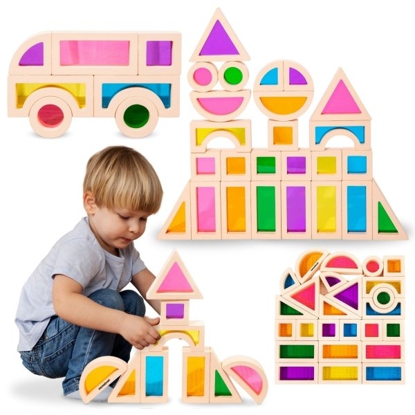 Tęczowe klocki drewniane – 25 elementówDrewniane klocki z kolorowymi lusterkami to gwarancja fantastycznej zabawy dla każdego smyka! Można z nich tworzyć dowolne konstrukcje, a jednocześnie obserwować barwny efekt, który zapewniają umieszczone wewnątrz okienka ze zróżnicowanymi pod względem odcienia, półprzezroczystymi płytkami.Marka: MamabrumModel: MAM217 ACRYLIC BLOCKUkładanie klocków to jedna z ulubionych czynności maluszków. Tęczowy zestaw czyni zabawę jeszcze bardziej atrakcyjną. Jego elementy różnią się od siebie kształtem oraz kolorem umieszczonego wewnątrz lusterka. Światło dzienne czyni je bardziej intensywnymi. Pozwala także eksperymentować z kolorami poprzez nakładanie jednego klocka na drugi. Rezultaty bez wątpienia sprawią maluszkom wiele radości!Główne cechyklocki wykonane z wysokiej jakości drewnakażdy klocek zawiera kolorowe szkiełko z tworzywa sztucznegozestaw tworzy 25 zróżnicowanych pod względem koloru i kształtu elementówwykorzystywany nie tylko do zabawy, ale też w terapii integracji sensorycznejstaranne wykończenie, z troską o każdy szczegółminimalistyczny designekologiczny charakterwysoka odporność na uszkodzenia, solidne wykonaniedla dzieci powyżej 2. roku życiaKlocki, które rozwijają zmysłyUkładanie klocków to bez wątpienia fantastyczna zabawa , która nigdy nie nudzi się maluszkom. Tęczowy zestaw jeszcze bardziej ją urozmaici, sprawiając smykom mnóstwo radości, a jednocześnie pobudzając ich zmysły. Zawarte w nim elementy to źródło licznych bodźców wzrokowych. Wykorzystywane do stymulacji sensorycznej, wspomagają zrównoważony rozwój dziecka.Nauka kolorów i kształtów z tęczowym zestawemZestaw zawiera aż 25 elementów o różnym kształcie i kolorze lusterka. Okienka przybierają zróżnicowane odcienie, w zależności od natężenia światła oraz ilości nałożonych na siebie klocków. To fantastyczna zabawa, a zarazem znakomity wstęp do nauki kolorów i podstawowych kształtów, takich jak kwadrat, prostokąt, trójkąt czy koło. Z tęczowymi klockami maluch może odkrywać świat kolorów i zachwycać się nim. Klocki można wykorzystywać zarówno jako źródło rozrywki, jak i do nauki.Tęczowe klocki dla rozwoju sprawności manualnejTworzenie z wielobarwnych klocków różnych konstrukcji to znakomity trening chwytu dla maluszka, a zarazem okazja do kształtowania koordynacji wzrokowo-ruchowej. Podczas zabawy dziecko ćwiczy sprawność manualną, ale nie tylko. Tęczowe klocki pobudzają także jego wyobraźnię i wspomagają rozwój logicznego myślenia.Specyfikacjawymiary: 21,2 x 23 x 5,5 cmwymiary opakowania: 24.5 x 21 x 5.5 cmwaga: 0,94 kgwaga z opakowaniem: 1,02 kgmateriał: lite drewno, tworzywo sztuczneBezpieczeństwoWykonany z dużą dbałością o detale zestaw tęczowych klocków nie posiada ostrych krawędzi. Spełnia wszelkie wymogi bezpieczeństwa, obowiązujące w UE, w tym dyrektywy CE i normę EN71-1/2/3….