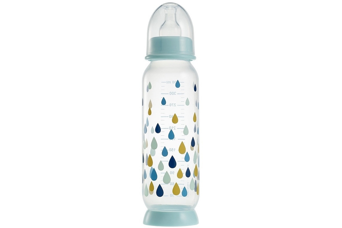 na zewnętrznej powierzchni butelki znajduje się motyw kolorowych kropli.