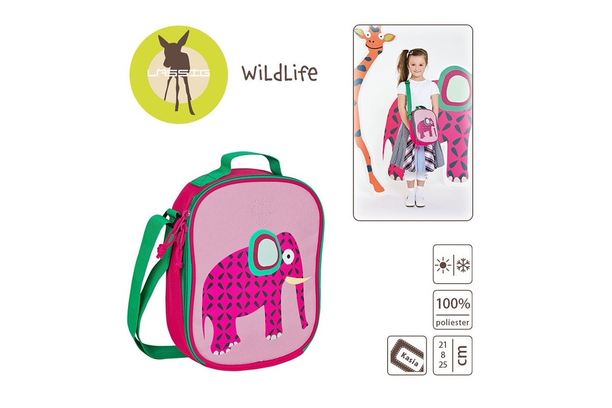 motyw uroczego słonia na wierzchu i kontrastowe, zielone detale (suwak, rączka i pasek).