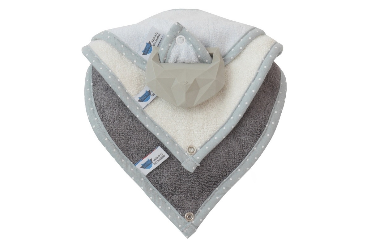 – 3 śliniaczki frote z wiskozy bambusowej w kolorze błękitnym, ecru i szarym,