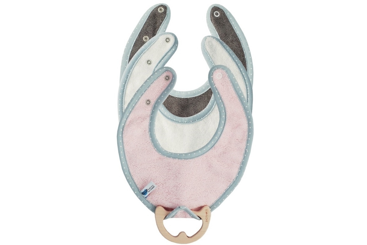 – 3 śliniaczki frote z wiskozy bambusowej w kolorze różowym, ecru i szarym,