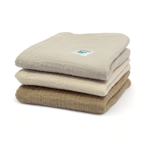 Trzy Muślinowe Pieluszki z Certyfikatem GOTS | 50×50 cm | 3 szt | natural – ecru – beżowy