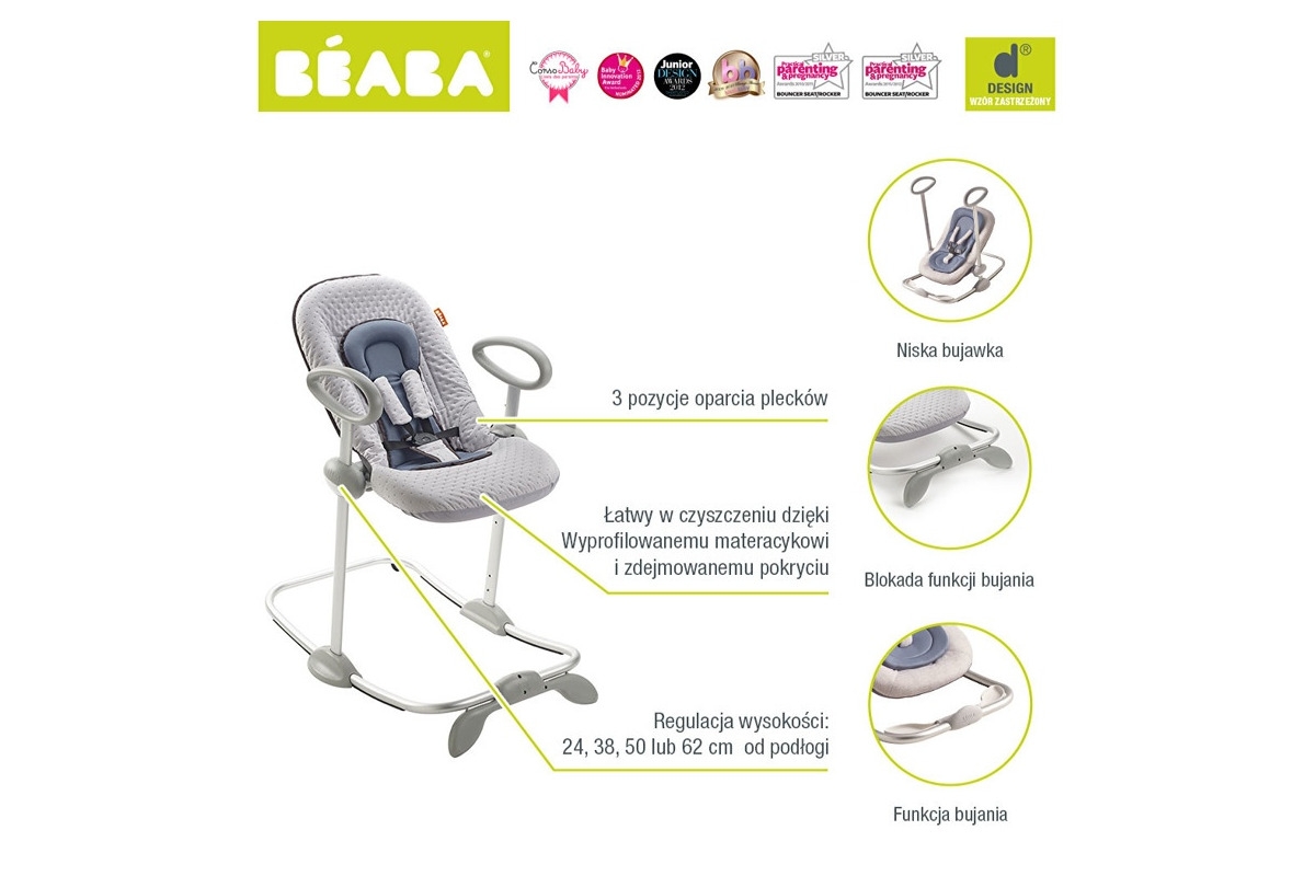 Leżaczek ma aż 4 możliwe wysokości siedziska – 24, 38, 50 lub 62 cm