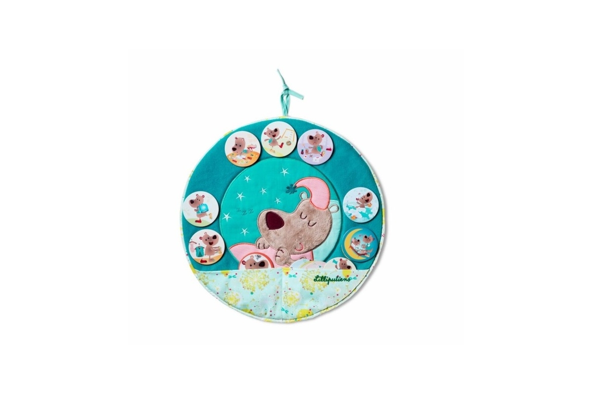Okrągły panel, który pomaga uporządkować dzień za pomocą okrągłych, przypinanych na rzep kart.
