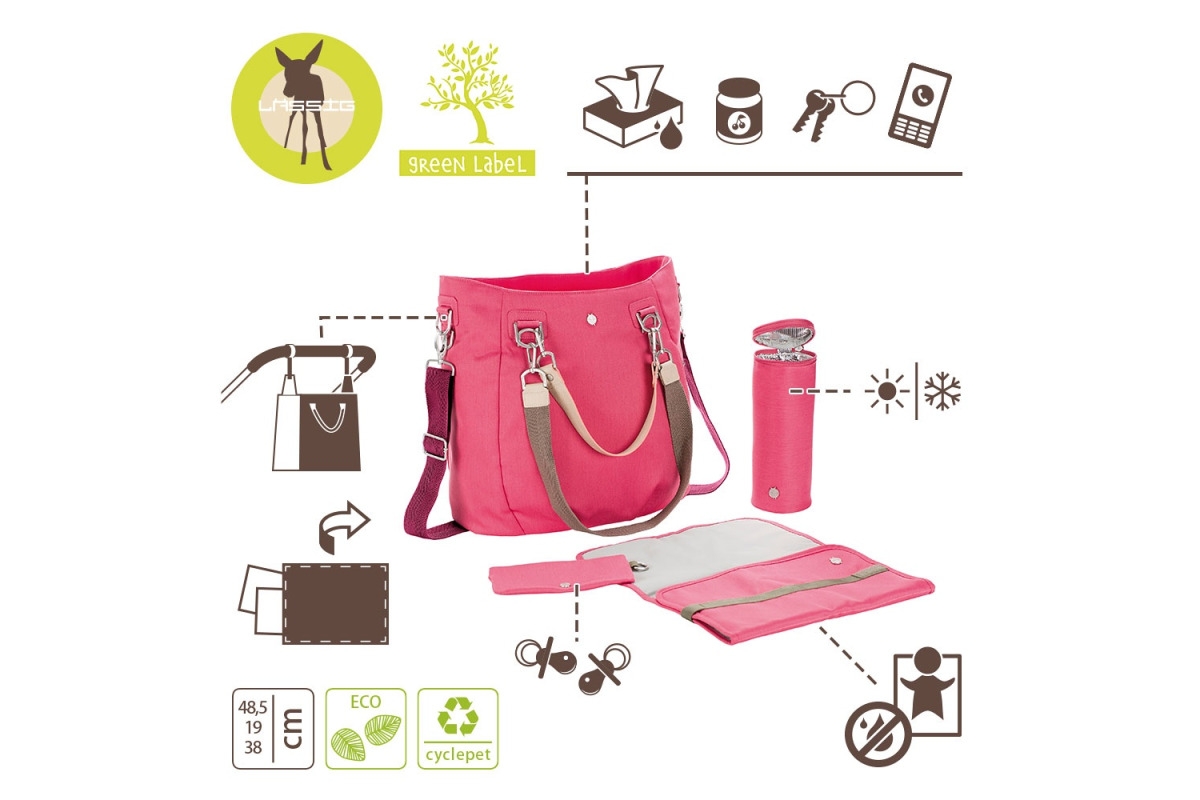 otwarta kieszonka na dołączoną do torby, poręczną, składaną matę do przewijania, w kolorze torby;