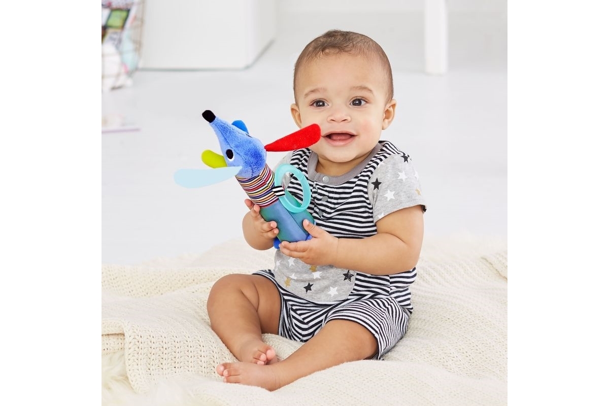 Połyskujący materiał i wyraźne, kontrastowe kolory zapewniają dziecku wzrokową stymulację,
