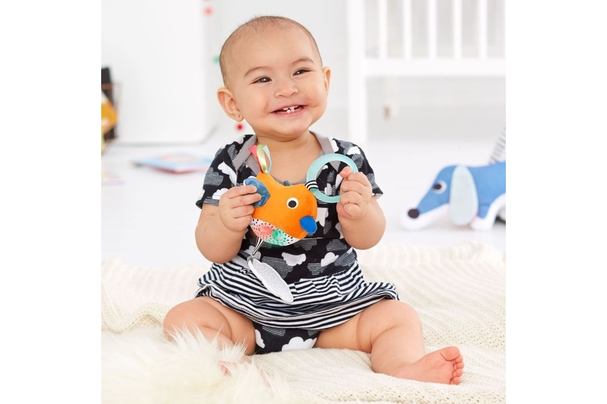 Dzięki specjalnemu uchwytowi można go zabrać wszędzie – wystarczy, że zawiesisz ją w wózku lub nosidełku.