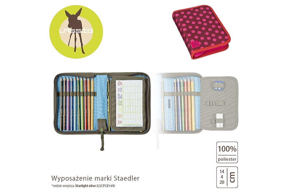 np. długopis czy nożyczki. Na zewnętrznej stronie rozkładanej klapki znajduje się plan lekcji.