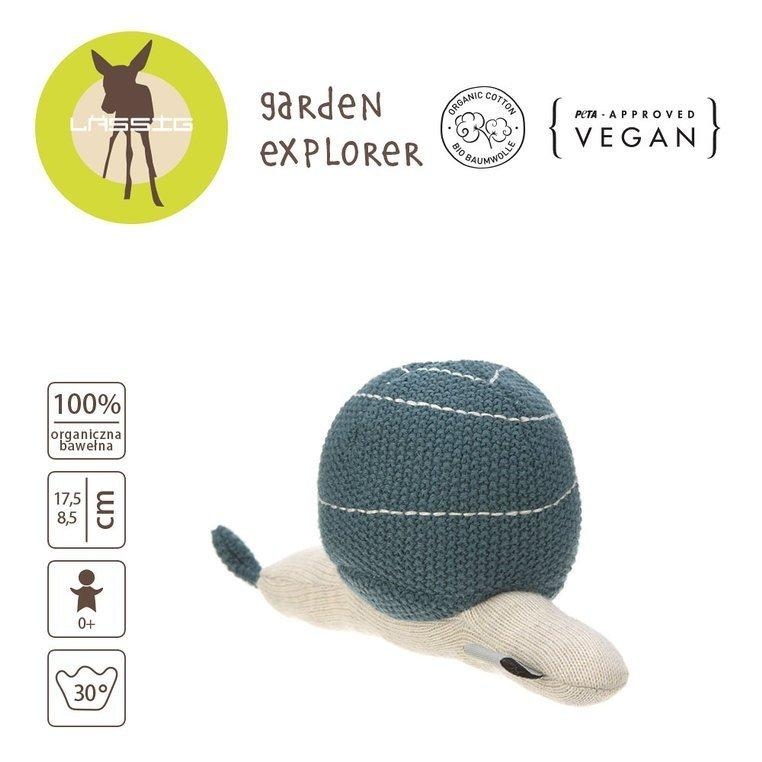 Śliczna i praktyczna dziergana przytulanka z grzechotką niemieckiej marki LASSIG to idealna pierwsza zabawka nie tylko dla małych miłośników przyrody. Miękki, urokliwy jasny ślimak z ciemnoniebieskimi różkami i muszelką-domkiem na grzbiecie wykonany został z wegańskiej bawełny organicznej. Jest bardzo przyjemny w dotyku, a przy potrząsaniu wydaje miły dla ucha dźwięk. Zabawa nim stymuluje dziecięcy zmysł słuchu i dotyku, trenuje chwyt oraz koordynację ręka-oko. Rozmiarami jest idealnie dopasowany do małych rączek.