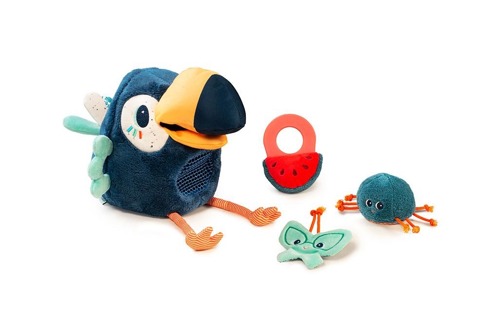 W jego imponującym dziobie ukryty jest dzwoneczek, a skrzydła i kuperek – szeleszczą. W zestawie znajdują się także trzy mniejsze pluszowe zabawki – szeleszczący motylek, puchaty pająk z bezpiecznym lusterkiem na brzuszku i plasterek arbuza, który ma wszyty delikatny dzwoneczek i okrągły silikonowy gryzak. Można nimi „nakarmić” tukana, wkładając je do jego dzioba, skąd wpadają do jego okrągłego dużego brzuszka – są tam widoczne, dzięki wszytej siateczce.