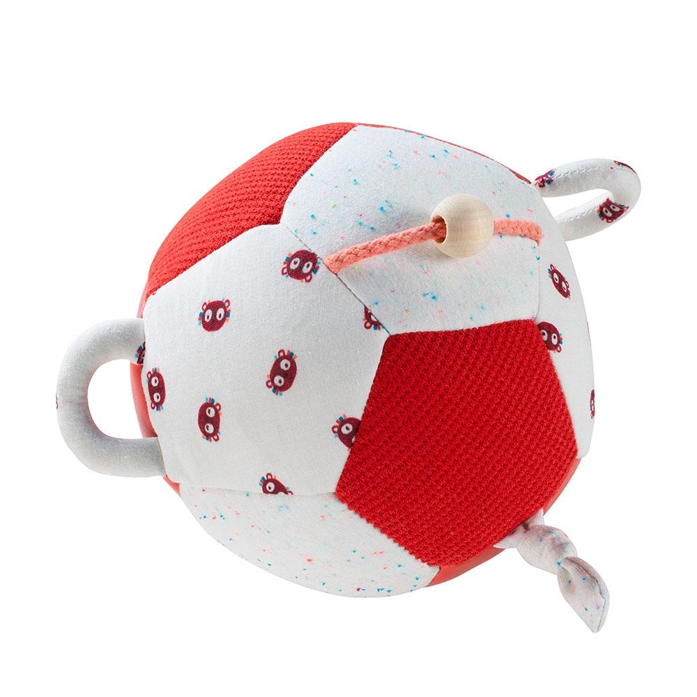 Uszyta z pięcioboków o czterech różnych fakturach i wzorach – w tym np. z tkaniny z multiprintem buźki Lemura Georga, z czerwonej, miękkiej tkaniny z drobną fakturą kratki i bladoczerwonego skóropodobnego materiału. Posiada również miękkie uchwyty, supełek oraz drewniany koralik do przesuwania na sznureczku. Potrząsana lub toczona wydaje przyjemny dźwięk dzwoneczka.