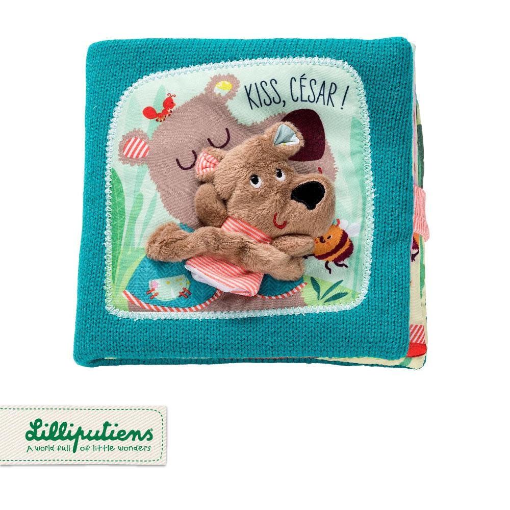 Książeczka ma przyjemną w dotyku okładkę, do której dołączona jest mini-pacynka Niedźwiadek Cesar w piżamce, którego można „ożywiać” po wsunięciu go na palec. Każda ze stron książeczki przedstawia inne zwierzątko – m.in. lisiczkę, lemura, słonia czy pszczołę, któremu niedźwiadek daje buziaka i do którego przytula się przed snem.