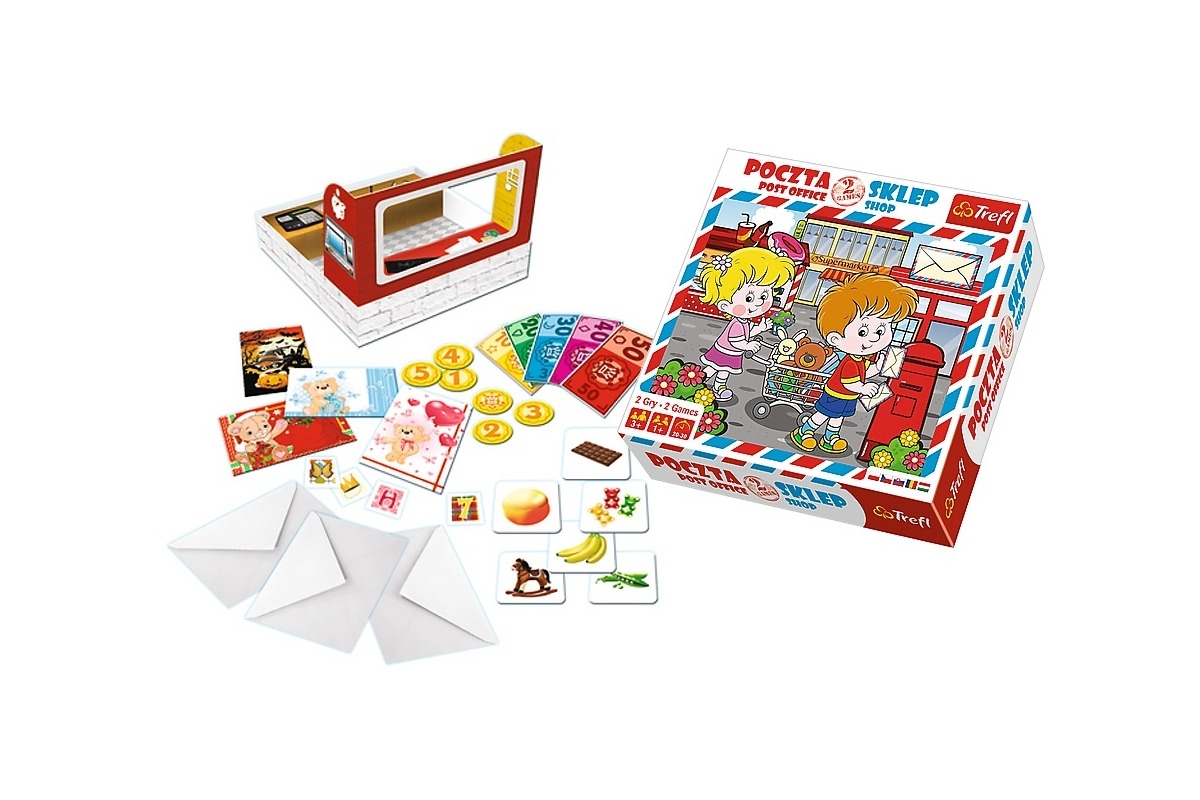 – 58 klocków z artykułami do kupowania, 30 banknotów, 12 kartek pocztowych,