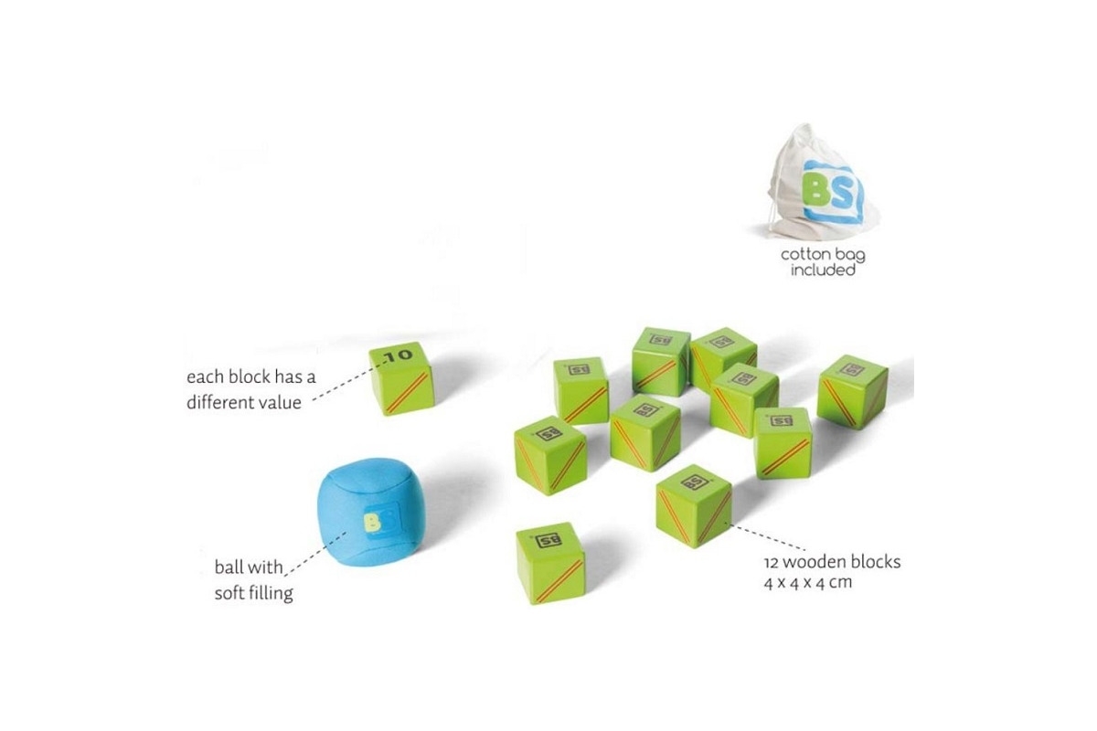 – 12 drewnianych kostek, piłeczkę z neoprenu,