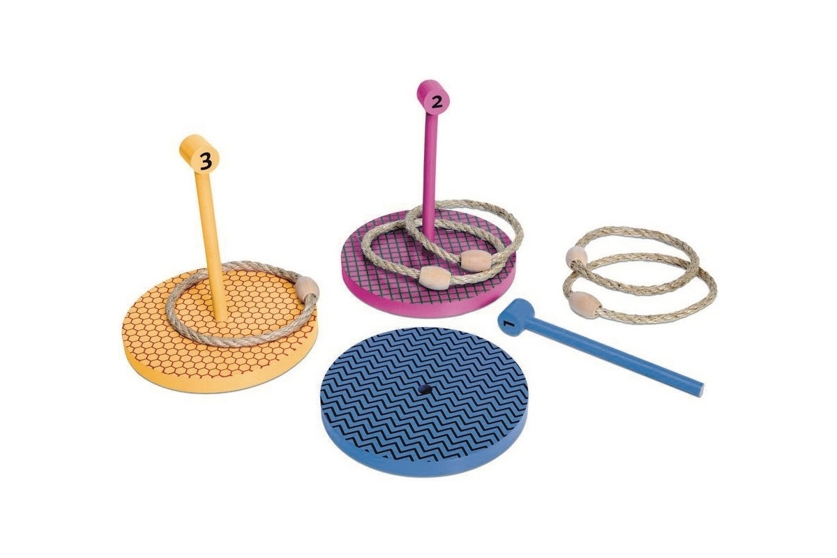 – 3 drewniane różnokolorowe krążki oraz 5 sznurkowych obręczy