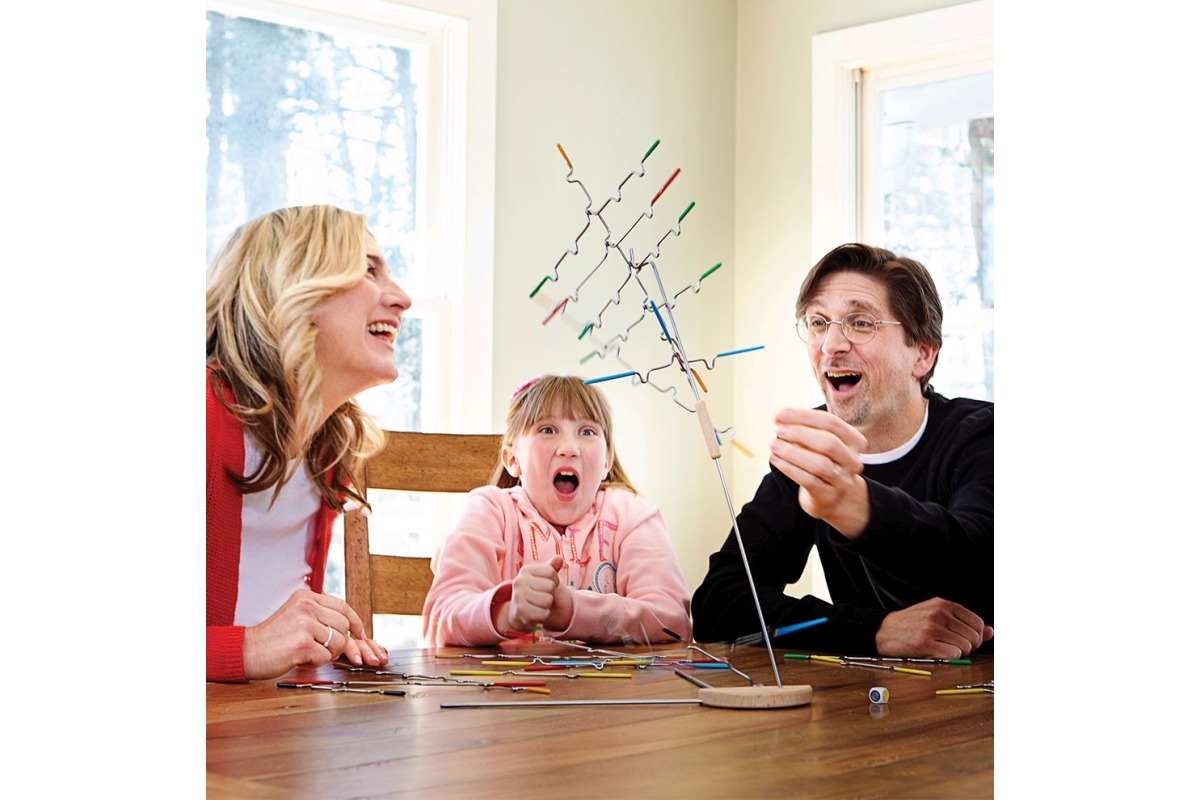 Zabawa polega na zwieszeniu pręcika tak, aby wieża sie nie zawaliła.