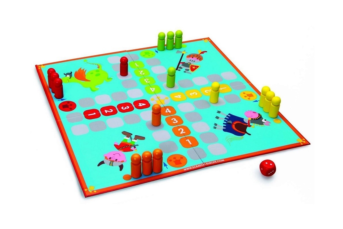 – komplet 4 drewnianych pionków do gry w 4 kolorach, planszę do gry, kostkę