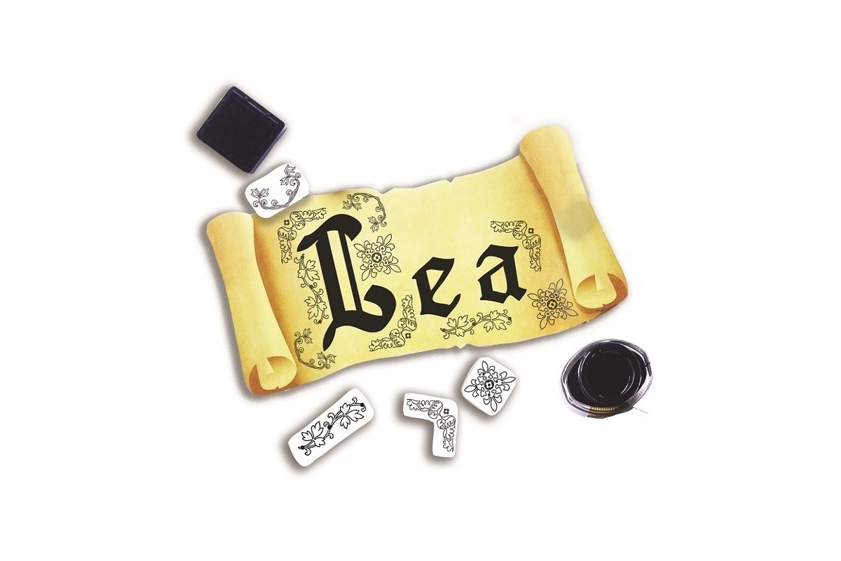 – 3 papierowe karteczki w kształcie zwoju i alfabet z pismem w stylu średniowiecznym
