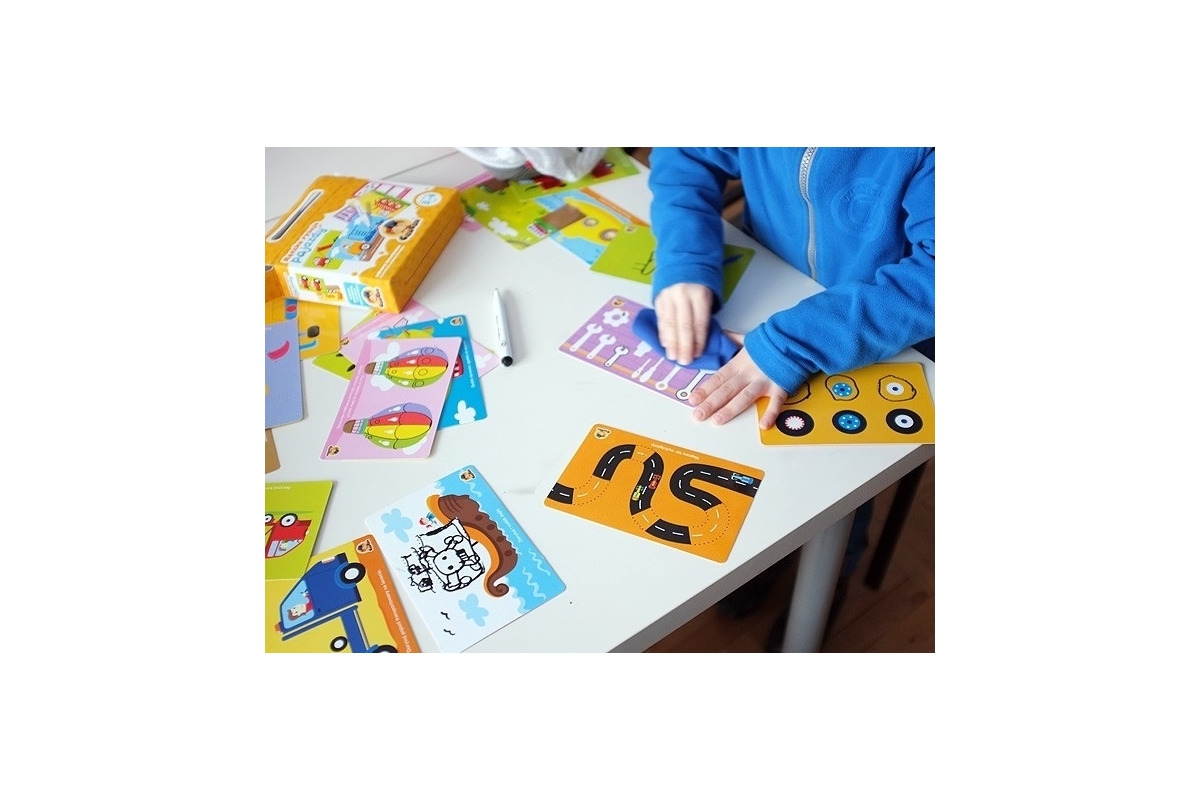 – 64 ilustracje na 32 kartach, pisak suchościeralny, ściereczkę.