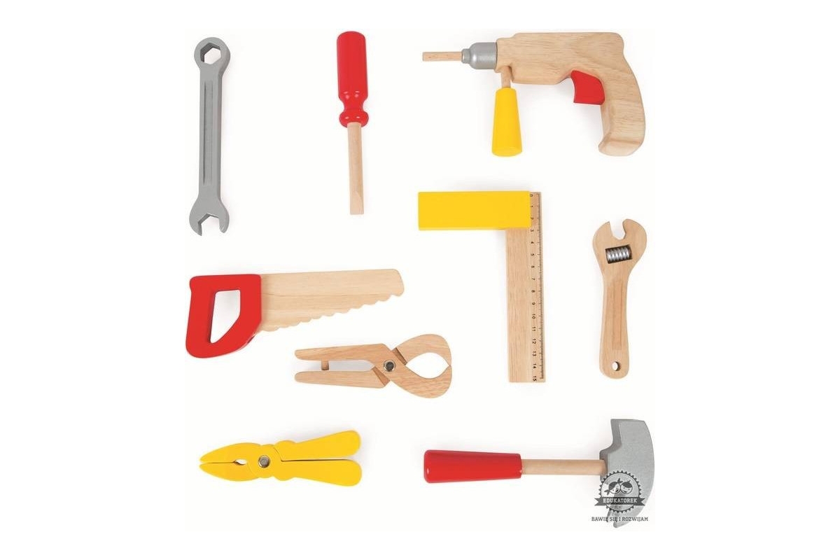 młotek, kombinerki, piłę, śrubokręt, klucz francuski, wiertarkę, klucz i kątomierz.