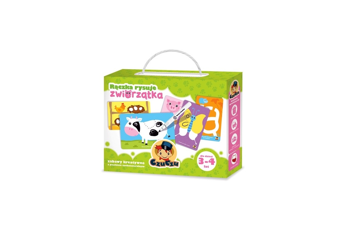 – 64 ilustracje na 32 kartach, pisak suchościeralny, ściereczkę.