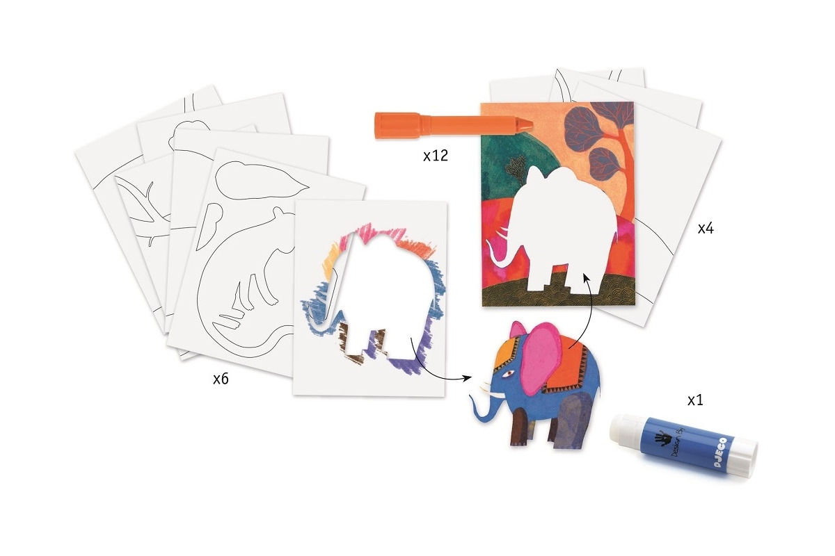 – 12 pasteli żelowych,  6 konturów zwierząt