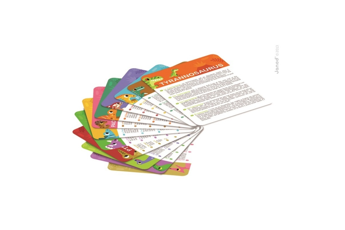 – 12 kart edukacyjnych z informacjami na temat dinozaurów,