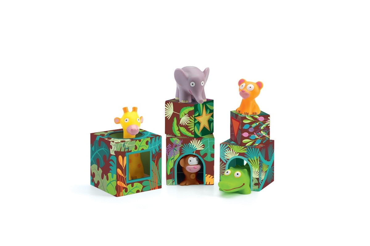 – 5 pudełek i 5 zwierzątek: żyrafa, słonik, tygrysek, małpka i krokodyl.
