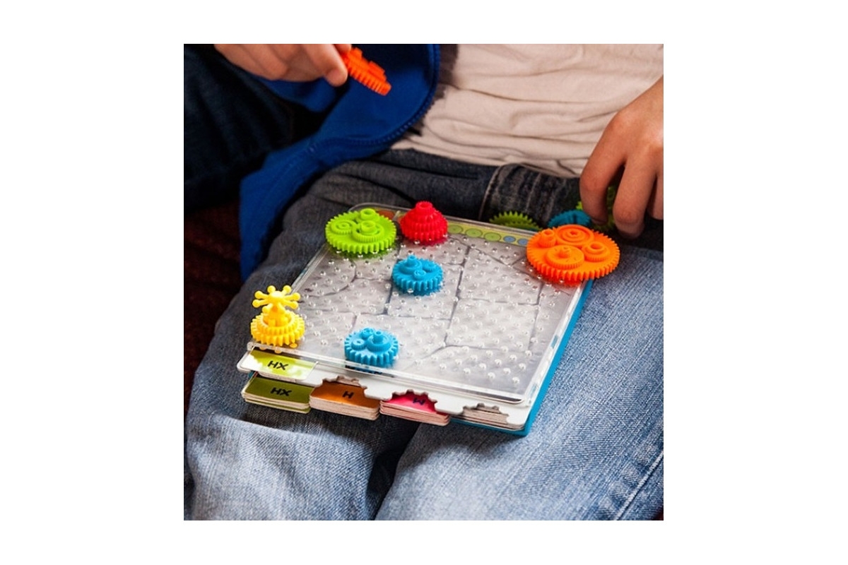 – 40 zadań o 4 poziomach trudności, 15 kolorowych kółek zębatych,
