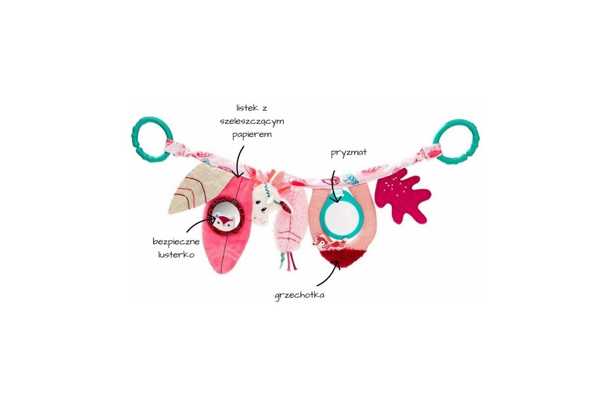 Różnorodna faktura materiału, miękkie, bezpieczne materiały zwrócą uwagę dziecka.