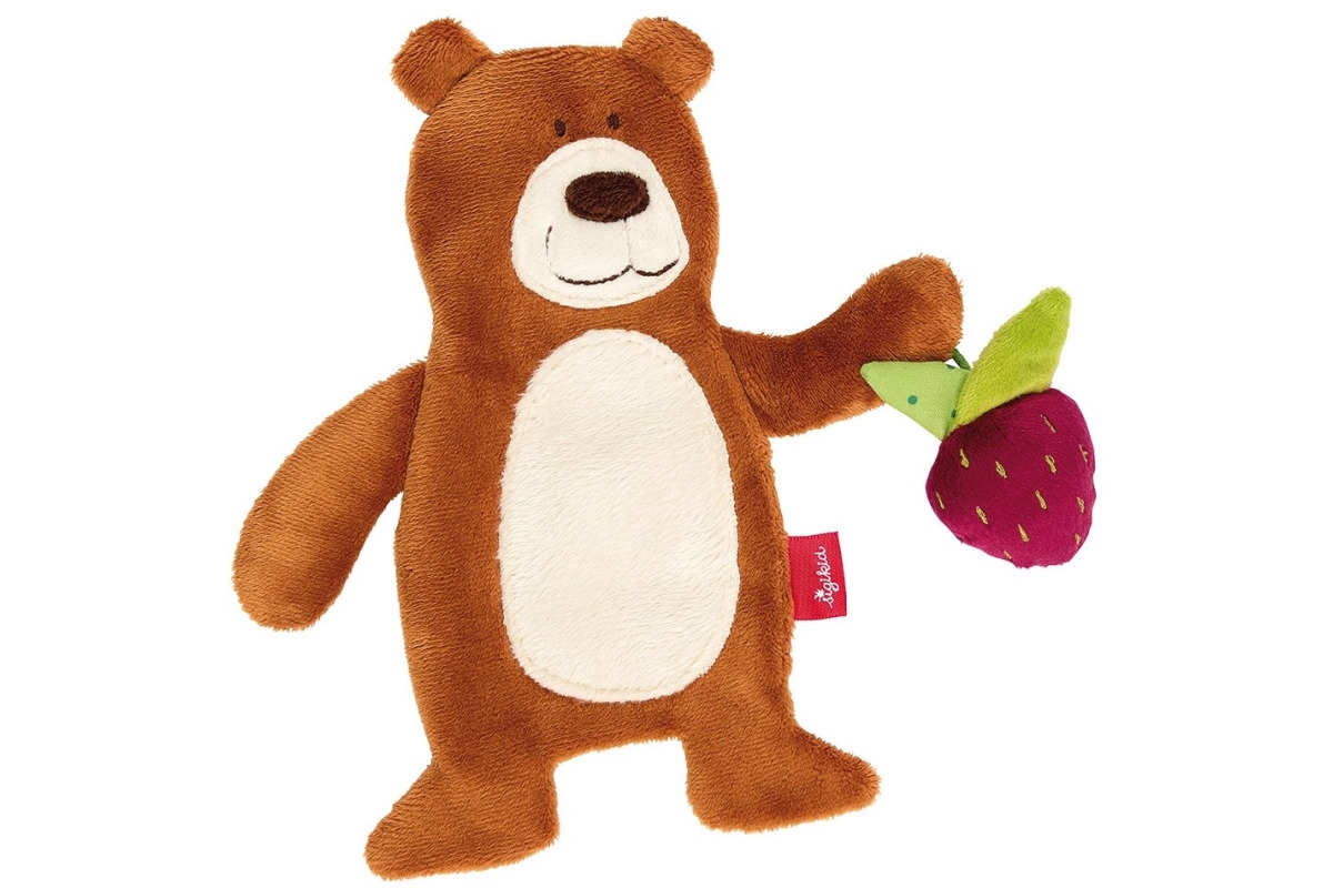 Ma postać płaskiej przytulanki brązowego misia, który w łapce trzyma truskawkę-grzechotkę.
