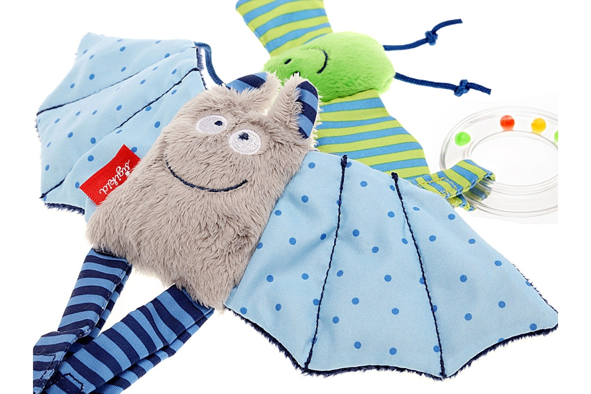 Ma postać uroczego szaro-niebieskiego, puchatego nietoperza z dużymi rozłożonymi skrzydłami. Jego nogi to mocowania na rzepy (wisi więc jak prawdziwy nietoperz głową do dołu). Przytulanka wyposażona jest w transparentną grzechotkę oraz małego nietoperza z szeleszczącymi skrzydełkami i piszczałką, dzięki którym aktywizuje rozwój sensoryczny i tzw. małą motorykę Maluszka.