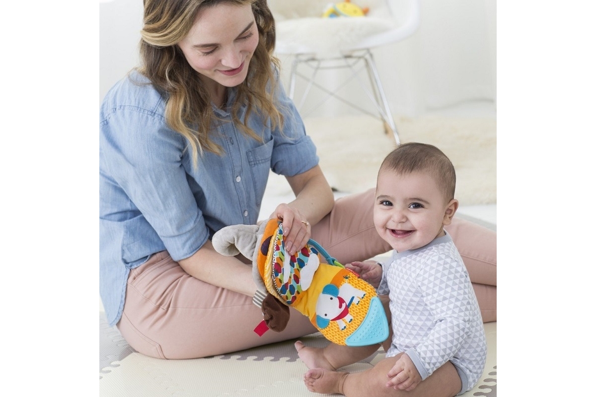 Książeczka posiada bezpieczne dla dziecka małe lusterko, okienko „a kuku”, marszczone tkaniny i piszczałki.