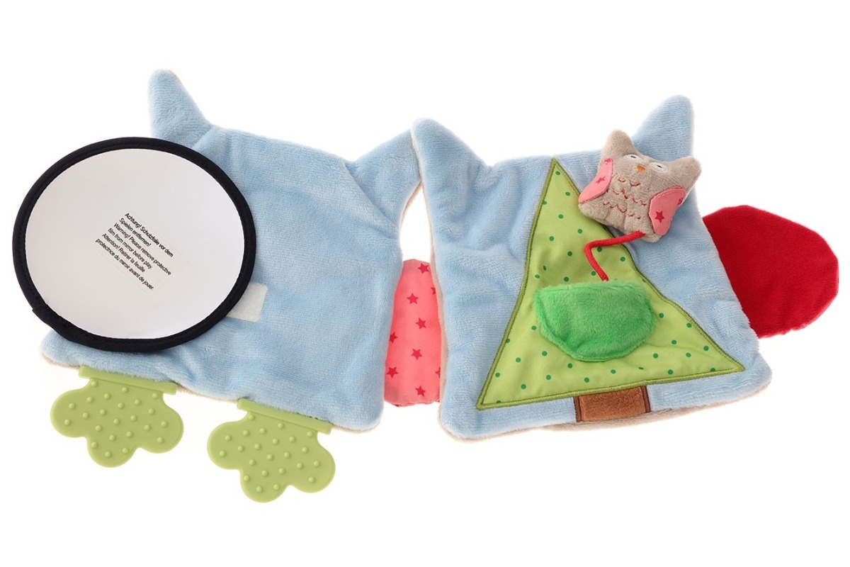 Przyjazna brązowa sówka rozkłada się na wzór książki, na jednej z jej wewnętrznych stron umieszczone jest bezpieczne, giętkie lusterko, na drugiej zaś – drzewko z gniazdkiem, w którym znajduje się malutka, wyjmowana grzechocząca sówka.