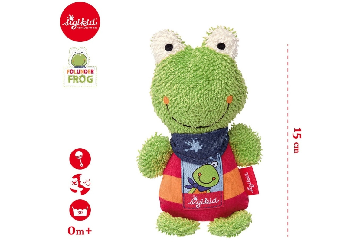 Przytulanka grzechotka Żabka Folunder przeznaczona jest dla dzieci od pierwszych dni życia. Ma postać radosnej, zielonej żabki, uszytej ze specjalnej pętelkowej tkaniny, dużo dobrej energii i soczyste kolory (obok zieleni dominuje pomarańcz).