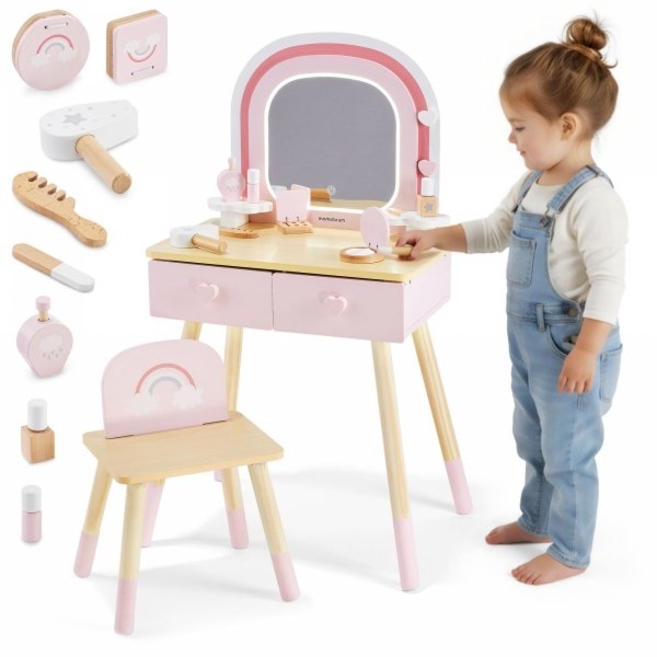 Drewniana toaletka dla dzieci z oświetleniem LED o płynnej regulacji jasności, krzesełkiem i akcesoriami