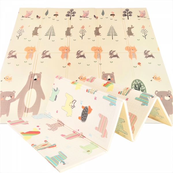Dwustronna mata piankowa XXL – 200 x 180 x 1 cm – składana (las z misiem i koniki)