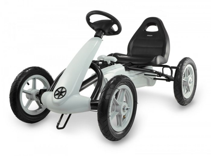 HYPERMOTION EVOQUE – Duży gokart z napędem na pedały dla dzieci 5+ / 50kg maxModel: EvoqueMarka: HypermotionPrzeznaczenie:dla dzieci w wieku ok. 5 – 8 latmaksymalna waga użytkownika: 50 kgCechy szczególne:Pompowane duże koła o średnicy ~30 cm, łożyskowaneSolidna metalowa ramaBezpieczeństwo zapewnia łatwo dostępny hamulec ręczny – na oba tylne kołaPełna osłona napędu – co uniemożliwia przypadkowe uszkodzenie np nogawek od spodni.Bieg wsteczny i “luz”:Gokart Evoque posiada trzy tryby jazdy:1) jazda do przodu2) jazda do tyłu3) neutralny – wolne kołoKomfort zapewnia regulowane, kubełkowe siedzisko w sportowym styluWyprofilowany fotel posiada możliwość regulacji przód-tył w zakresie kilku centymetrów.Wymiary gokarta dla dzieci EVOQUE:długość całkowita: 113 cmszerokość: 62 cmwysokość do kierownicy: 65 cmwysokość od ziemi do podstawy siedziska: ok. 34 cmkoła: 4 x 12 cali (ok. 30cm)Rozmiar opakowania: 101.5 x 65 x 26 cm / ok. 14 kg…