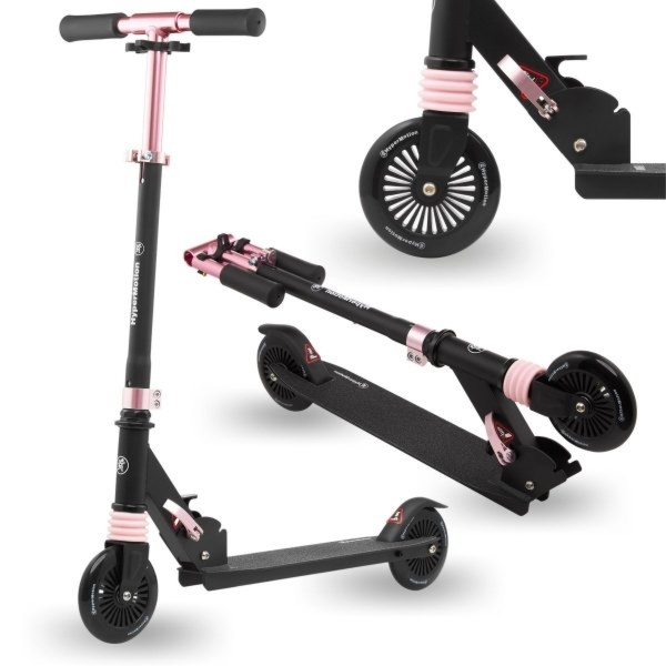 Dwukołowa hulajnoga dla dzieci Wally od HyperMotion czarno-różowaMarka: HyperMotionModel: WallyZalecany wiek dziecka: 4+ (do 140 cm wzrostu)Cechy szczególne: amortyzator, galwanizowany drążek, poliuretanowe kołaKolor: różowy, czarny matDwukołowa hulajnoga Wally to doskonały sposób na aktywną i bezpieczną zabawę. Nowoczesny design i doskonałe materiały sprawiają, że Wally jest niezwykle lubianym i popularnym modelem. Idealnie sprawdzi się podczas spaceru, w drodze do przedszkola lub szkoły.Główne cechy:Przedni amortyzator3-stopniowa regulacja wysokości kierownicy 72 – 78 – 83 cmPoliuretanowe koła o średnicy 125 mm charakteryzują się niezwykle dużą wytrzymałością i odpornością na ścieranieWysokiej klasy łożyska ABEC-7 (podnoszą stabilność oraz płynność jazdy)Wygodne, składane rączki oraz uchwyty do ich wpinaniaAntypoślizgowy podestPodwójna klamra zaciskowaBardzo lekka – zaledwie 2.5 kg!Prosty system składania i rozkładania – wystarczy kilka sekund!Lekka i zwrotnaWygodne gumowe rączki zapewniające bardzo dobrą przyczepnośćStylowy drążek w kolorze czarnego matu Galwanizowane elementy hulajnogi (klamra zaciskowa, regulowana część drążka, kierownica)Unikatowy, nowoczesny designWyjątkowy komfort jazdyHulajnoga Wally została wyposażona w specjalny amortyzator, który odciąża całą konstrukcję i absorbuje wstrząsy, dzięki czemu poruszanie się po nierównościach jest dużo wygodniejsze.Mniejsza ilość drgań przekłada się również na większą stabilność i bezpieczeństwo jazdy.Najlepsze kołaKauczukowe koła (poliuretan PU) zapewniające najwyższy komfort jazdy. Odporne na ścieranie, wilgoć i niskie temperatury.Wytrzymały bieżnik sprawia, że koła doskonale radzą sobie na bardzo wielu nawierzchniachWysokiej klasy łożyska ABEC-7 podnoszą stabilność oraz płynność jazdyLekka i kompaktowaBardzo lekka – zaledwie 2.5 kgWygodny system składania i rozkładania – wystarczy kilka sekund!Kompaktowy rozmiar po złożeniu ułatwia transport i przechowywanie. Wymiary po złożeniu: 65 x 22 cmBezpieczeństwo przede wszystkim!Hulajnoga Willy ma nie tylko sprawiać radość najmłodszym, ale przede wszystkim musi być bezpieczna, dlatego dbamy o to, aby spełniała wszelkie normy bezpieczeństwa.Hulajnoga została przetestowana zgodnie z wymogami europejskiej normy bezpieczeństwa EN-71.Stalowy hamulec nożny pozwala na płynną regulację szybkości jazdy oraz pełni funkcję błotnika chroniącego przed zachlapaniem.Wygodne gumowe rączki zapewniają bardzo dobrą przyczepność.Antypoślizgowy aluminiowy podest – zapobiega ześlizgnięciu się stopy podczas jazdy.Specyfikacja:Wymiary hulajnogi: 68 x 33 x 83 cmRegulacja wysokości kierownicy: 72 – 83 cmWymiary podestu: 45 x 10 cmWysokość podestu: 8 cmWymiary po złożeniu: 65 x 22 cmKoła o średnicy 125 mm kauczukowe (poliuretan PU)Łożyska: ABEC-7Waga hulajnogi: 2.5 kgMaksymalne obciążenie: 40 kg…