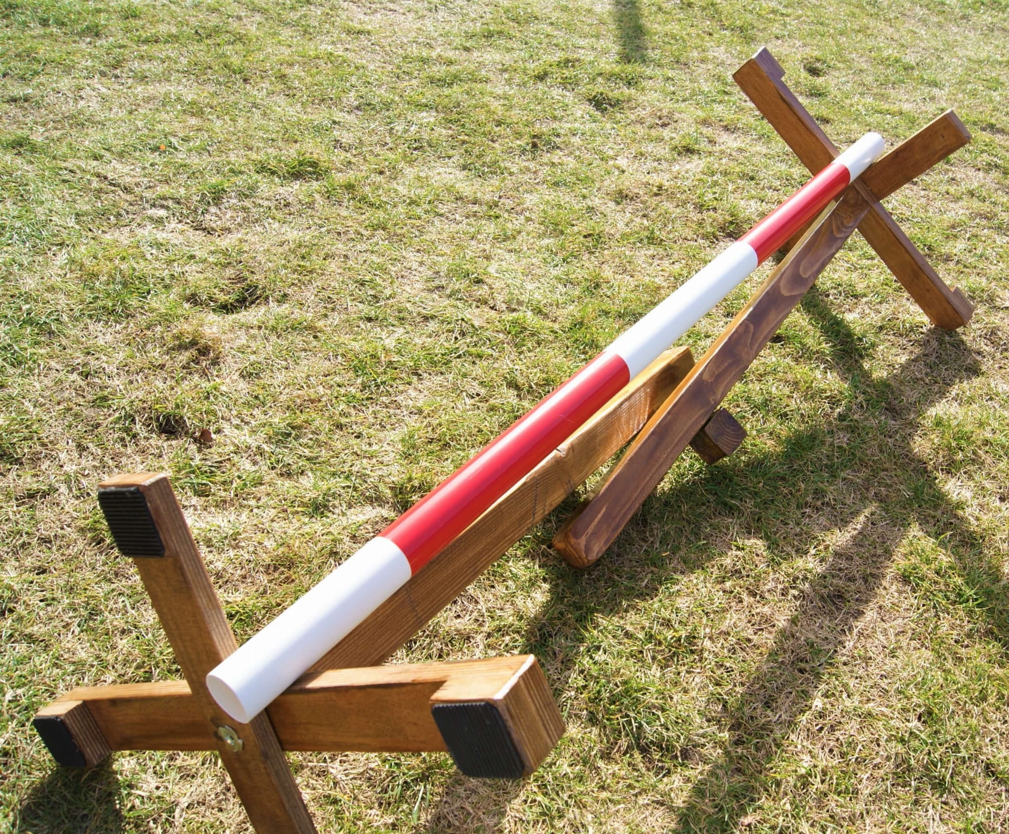 Przeszkoda treningowa Hobby Horse / Agility 120cm SZYBKI MONTAŻ I DEMONTAŻ BEZ ŻADNYCH NARZĘDZI Przeznaczenie: zabawa na zewnątrz oraz w pomieszczeniach dedykowanych do sportu Wymiary: Szerokość 120cm, Maksymalna Wysokość: 120cm DREWNO: 1.Suszone >>> 2. Szlifowane >>> 3. Malowane Główne zalety: Stabilna, Solidna, Mobilna Produkcja: Polska Metoda: Rzemieślnicza ( Hand Craft ) ✅Dopracowana konstrukcja wysokiej jakości. Stworzona aby spełnić wasze oczekiwania. ✅Regulacja wysokości, indykacja w centymetrach  ✅Podgumowane stopki antypoślizgowe Wybierasz wygodnie wysokość używając kłódek ( dedykowane podpory). Każdy słupek posiada regulację co 10cm aż do 120cm ( górna krawędź tyczki) Przy trąceniu nogą tyczka w sposób bezpieczny spada z podpory. W zestawie otrzymujesz tyczkę o długości 120cm ( lekka i bezpieczna dla dzieci) Tyczka: biało czerwona   Oprócz praktyczności i wytrzymałości otrzymujesz produkt przyjemny dla oka Stabilna konstrukcja dzięki solidnej składanej stopie Prosty, szybki montaż i demontaż bez użycia jakichkolwiek narzędzi Kompaktowe wymiary to duża mobilność po rozłożeniu Możesz zabrać do Parku, na Halę czy na urlop Nadaje się do użycia w warunkach zewnętrznych i dedykowanych wnętrz  * Po użyciu rekomendujemy aby chronić przed ekspozycją na deszcz i śnieg w suchym miejscu celem zwiększenia trwałości i estetyki produktu na wiele lat.    Zestaw 120cm zawiera: 2 x słupek 2 x kłódka (podpora) 2 x stopa krzyżakowa 1 x tyczka 120cm