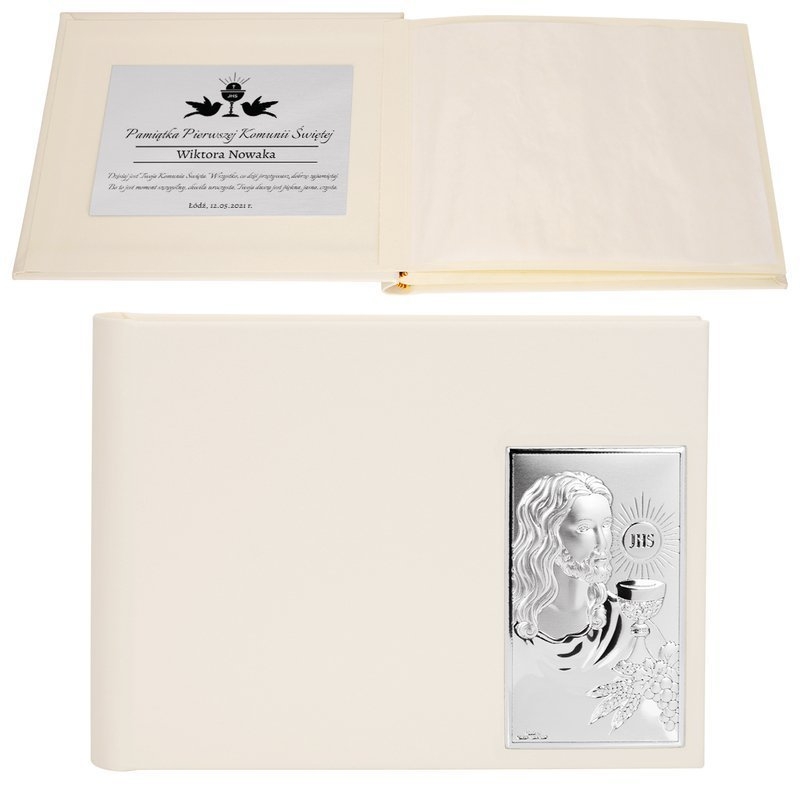 Album na zdjęcia, to doskonała pamiątka Pierwszej Komunii Świętej. W albumie można upamiętnić zdjęcia, które są wspomnieniem tej doniosłej, w życiu każdego dziecka chwili. Na okładce albumu umieszczony został srebrny ryngraf przedstawiający wizerunek Jezusa z eucharystią. Srebrny emblemat wykonany został w technologii PVD – płytka z innowacyjnego metalu MIRO-SILVER pokryta cienką warstwą srebra. Powierzchnia ryngrafu pokryta jest lakierem ochronnym, aby zapobiec działaniu czynników zewnętrznych. Album został wykonany z eko – skóry. Producentem albumu jest renomowana włoska firma Beltrami znana z wysokiej klasy wyrobów srebrnych i pamiątkarskich.