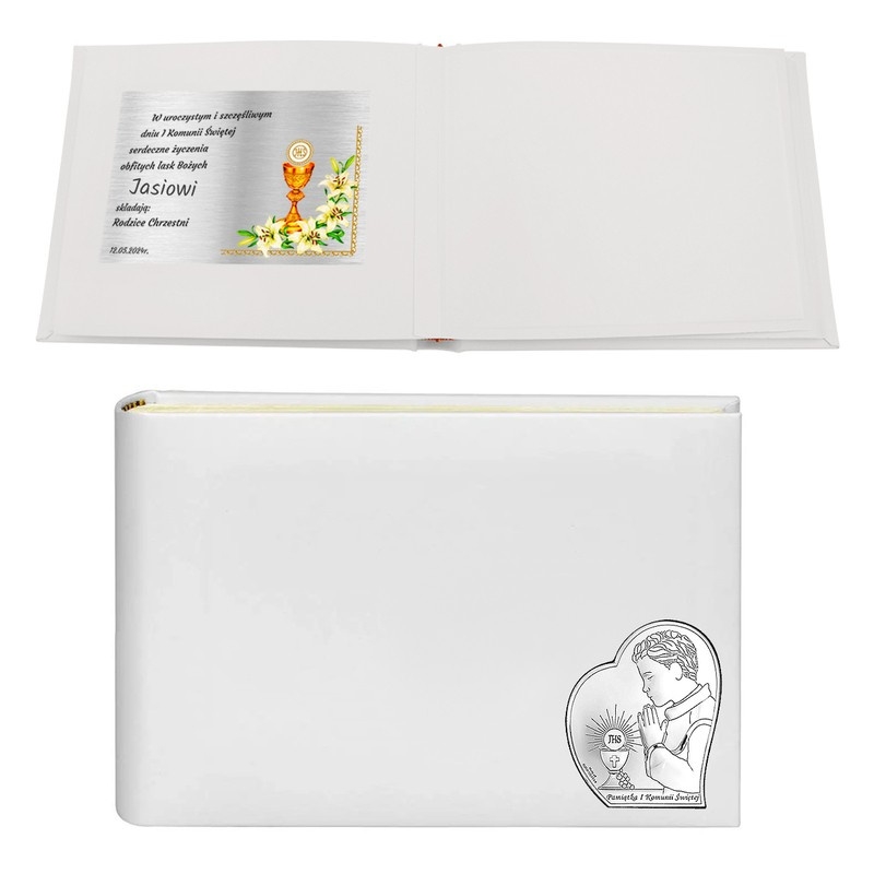 Album na zdjęcia, to doskonała pamiątka Pierwszej Komunii Świętej. W albumie można upamiętnić zdjęcia, które są wspomnieniem tej doniosłej, w życiu każdego dziecka chwili. Na okładce albumu umieszczony został srebrny ryngraf przedstawiający wizerunek chłopca, przystępującego do I Komunii Świętej. Srebrny emblemat wykonany został w technologii PVD – płytka z innowacyjnego metalu MIRO-SILVER pokryta warstwą srebra 999,95. Powierzchnia ryngrafu pokryta jest lakierem ochronnym, aby zapobiec działaniu czynników zewnętrznych. Album został wykonany z eko – skóry. Producentem albumu jest renomowana włoska firma Valenti & Co. znana z wysokiej klasy wyrobów srebrnych i pamiątkarskich.