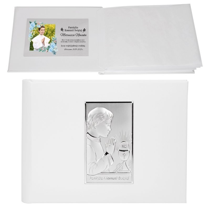 Album na zdjęcia, to doskonała pamiątka Pierwszej Komunii Świętej. W albumie można upamiętnić zdjęcia, które są wspomnieniem tej doniosłej, w życiu każdego dziecka chwili. Na okładce albumu umieszczony został srebrny ryngraf przedstawiający wizerunek chłopca, przystępującego do I Komunii Świętej. Srebrny emblemat wykonany został w technologii PVD – płytka z innowacyjnego metalu MIRO-SILVER pokryta cienką warstwą srebra. Powierzchnia ryngrafu pokryta jest lakierem ochronnym, aby zapobiec działaniu czynników zewnętrznych. Album został wykonany z eko – skóry. Producentem albumu jest renomowana włoska firma Beltrami znana z wysokiej klasy wyrobów srebrnych i pamiątkarskich.