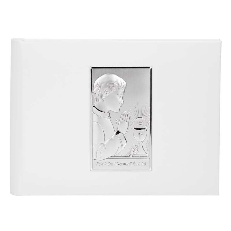 Album na zdjęcia, to doskonała pamiątka Pierwszej Komunii Świętej. W albumie można upamiętnić zdjęcia, które są wspomnieniem tej doniosłej, w życiu każdego dziecka chwili. Na okładce albumu umieszczony został srebrny ryngraf przedstawiający wizerunek chłopca, przystępującego do I Komunii Świętej. Srebrny emblemat wykonany został w technologii PVD – płytka z innowacyjnego metalu MIRO-SILVER pokryta cienką warstwą srebra. Powierzchnia ryngrafu pokryta jest lakierem ochronnym, aby zapobiec działaniu czynników zewnętrznych. Album został wykonany z eko – skóry. Producentem albumu jest renomowana włoska firma Beltrami znana z wysokiej klasy wyrobów srebrnych i pamiątkarskich.