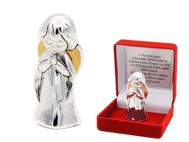 Figurka modlącego się aniołka (ok. 7 cm) od włoskiego producenta, wykonana z żywicy i pokryta srebrem próby 925 w technologii laminowania. W zestawie srebrna lub złota tabliczka z dedykacją i/lub zdjęciem oraz eleganckie etui prezentowe.