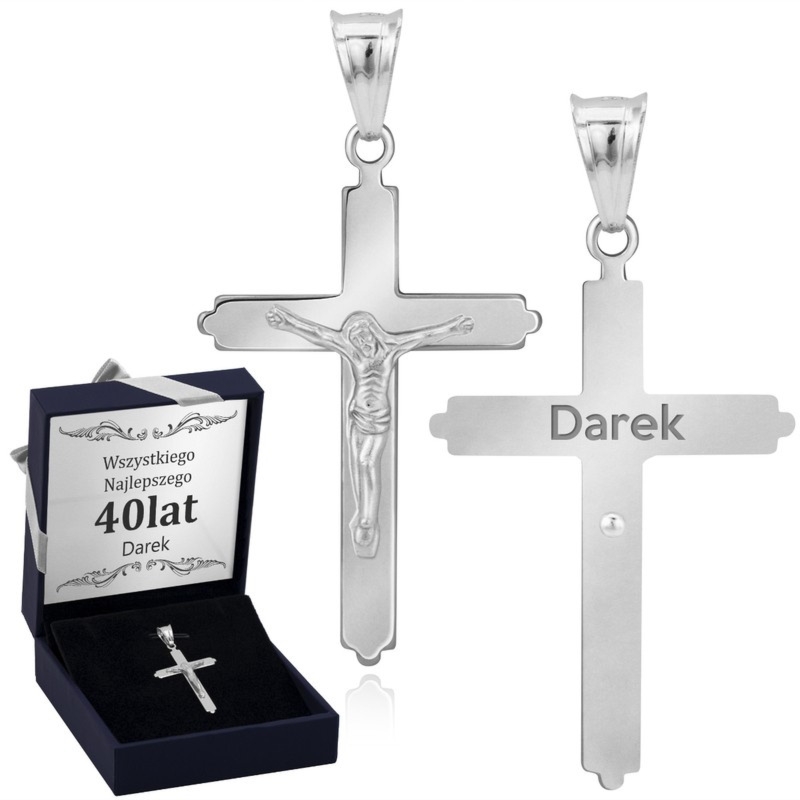 Srebrny krzyżyk z Jezusem pr.925 dla mężczyzny lub nastolatka, grawer imienia i daty, granatowe pudełko ze wstążką i dedykacją