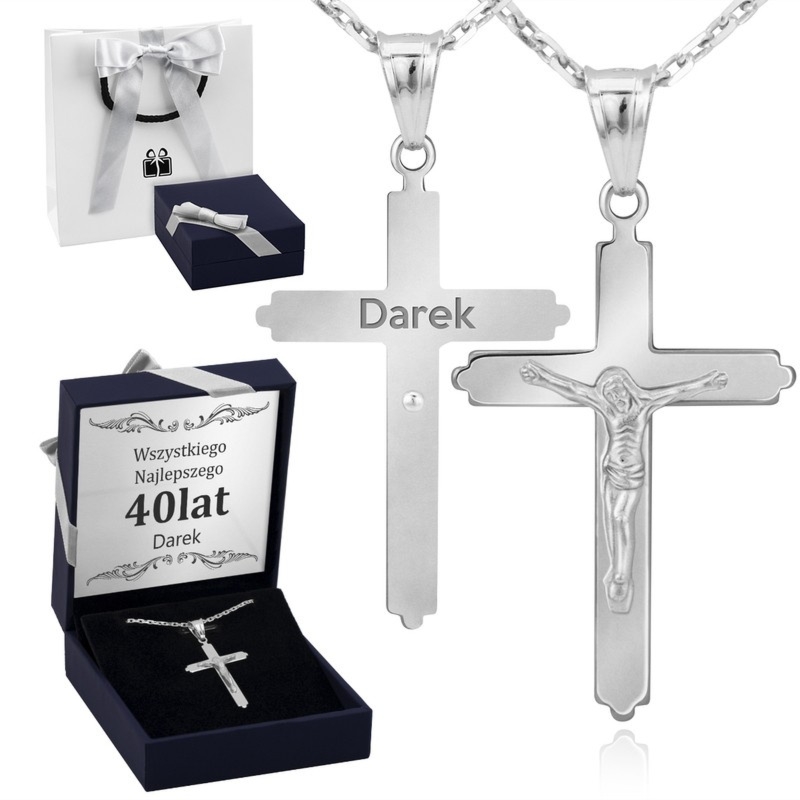 Duży srebrny krzyżyk z Jezusem z łańcuszkiem ankier oraz grawerem imienia i daty, w komplecie tabliczka z dedykacją
