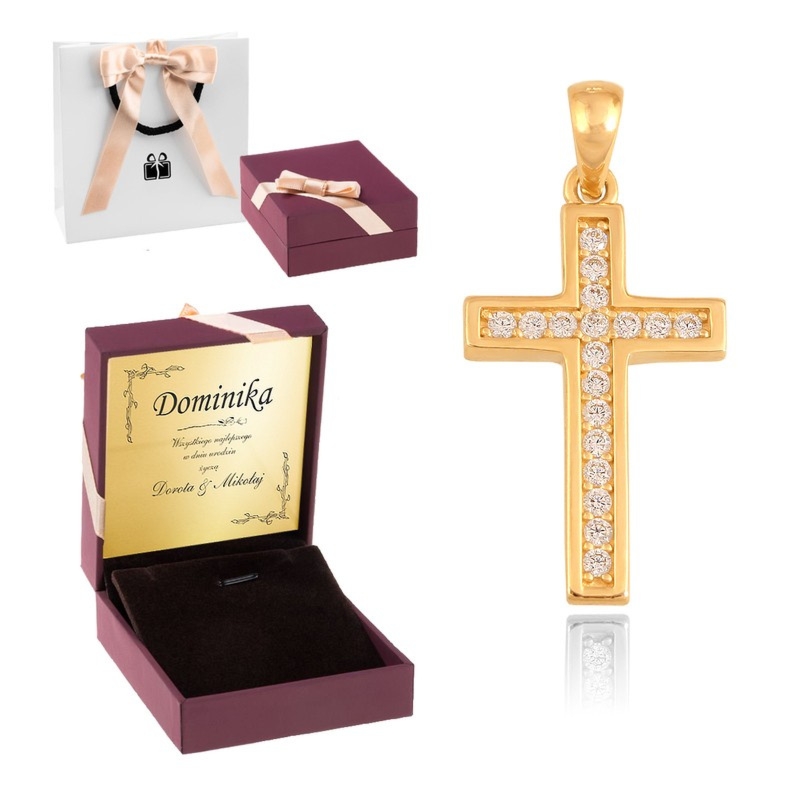 Złoty krzyżyk pr. 585 z cyrkoniami i tabliczką z dedykacją, w ozdobnym pudełeczku oraz z torebką prezentową
